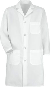 A protective garment worn by medical and scientific professionals to maintain hygiene and shield clothing from spills and contaminants.